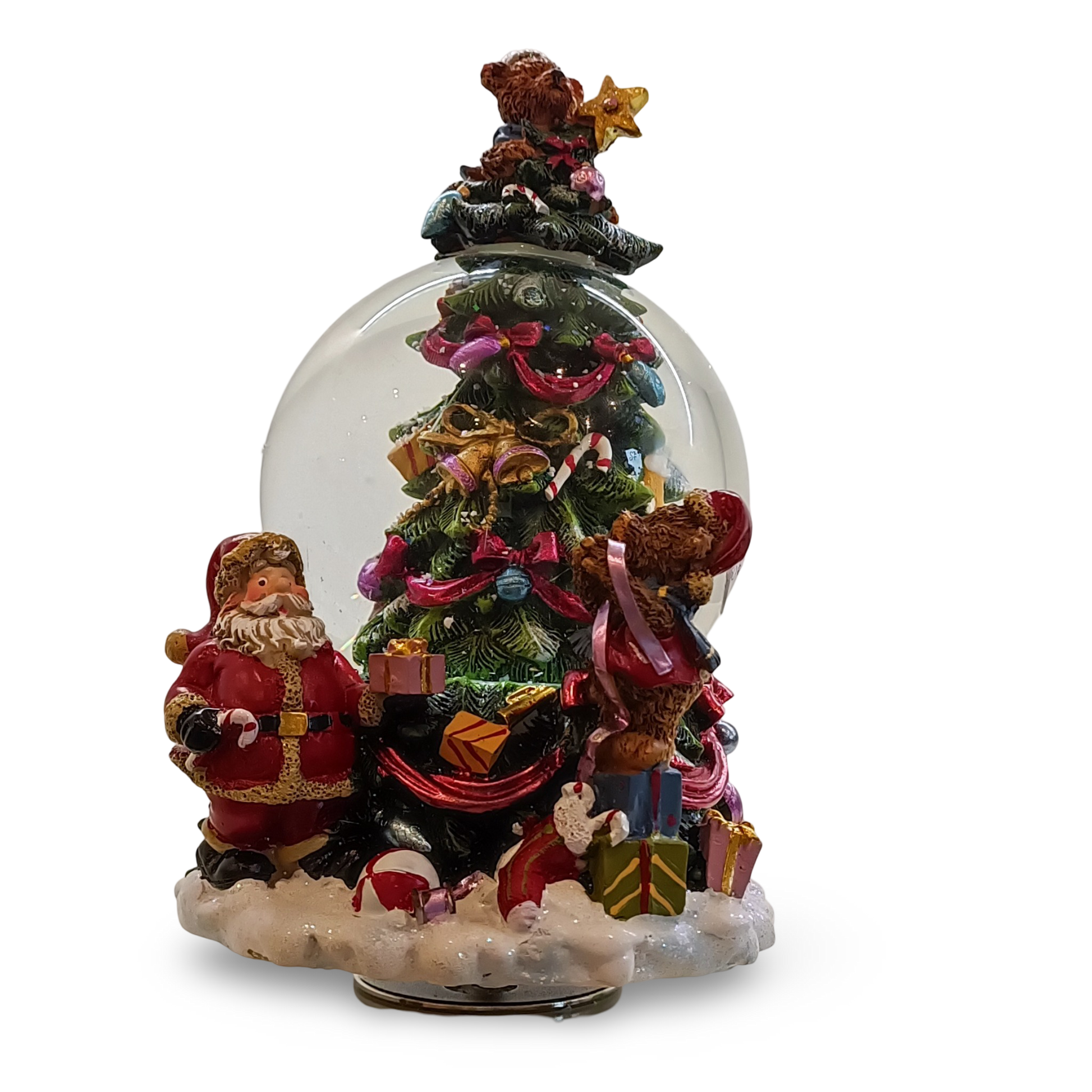 Árvore de Natal com Globo feita de pedra poli gira ao som da melodia “Oh Christmas Tree”. Medidas: Ø12x18,5 cm.