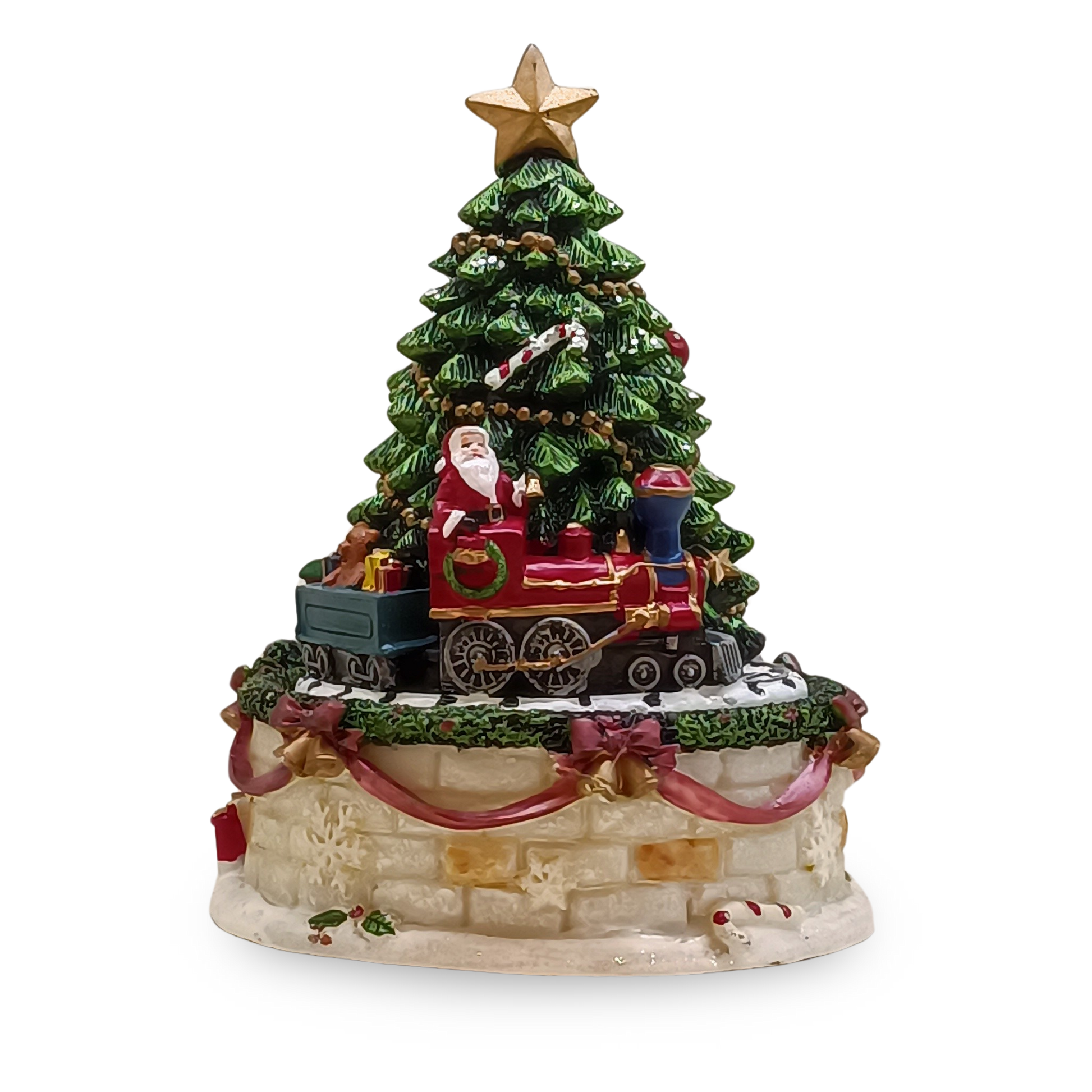 Árvore de Natal e Comboio com Pai Natal giram ao som da melodia “Oh Christmas Tree”. Altura 16 cm.