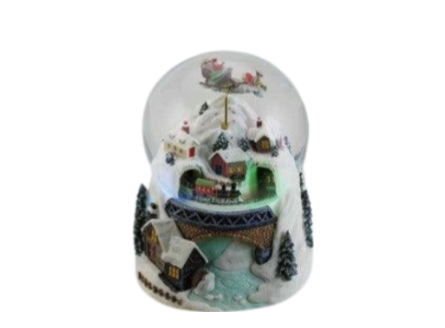Globo de Neve com Pai Natal e Trenó em uma cena iluminada. Pai Natal e Trenó giram enquanto a melodia “Jingle Bells” toca. Altura 5,5