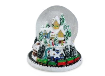 Globo de Neve com casas e comboio 120 mm. Toca a melodia Alegria para o mundo. Medida: 16,2 x 16,2 x 16,5 cm
