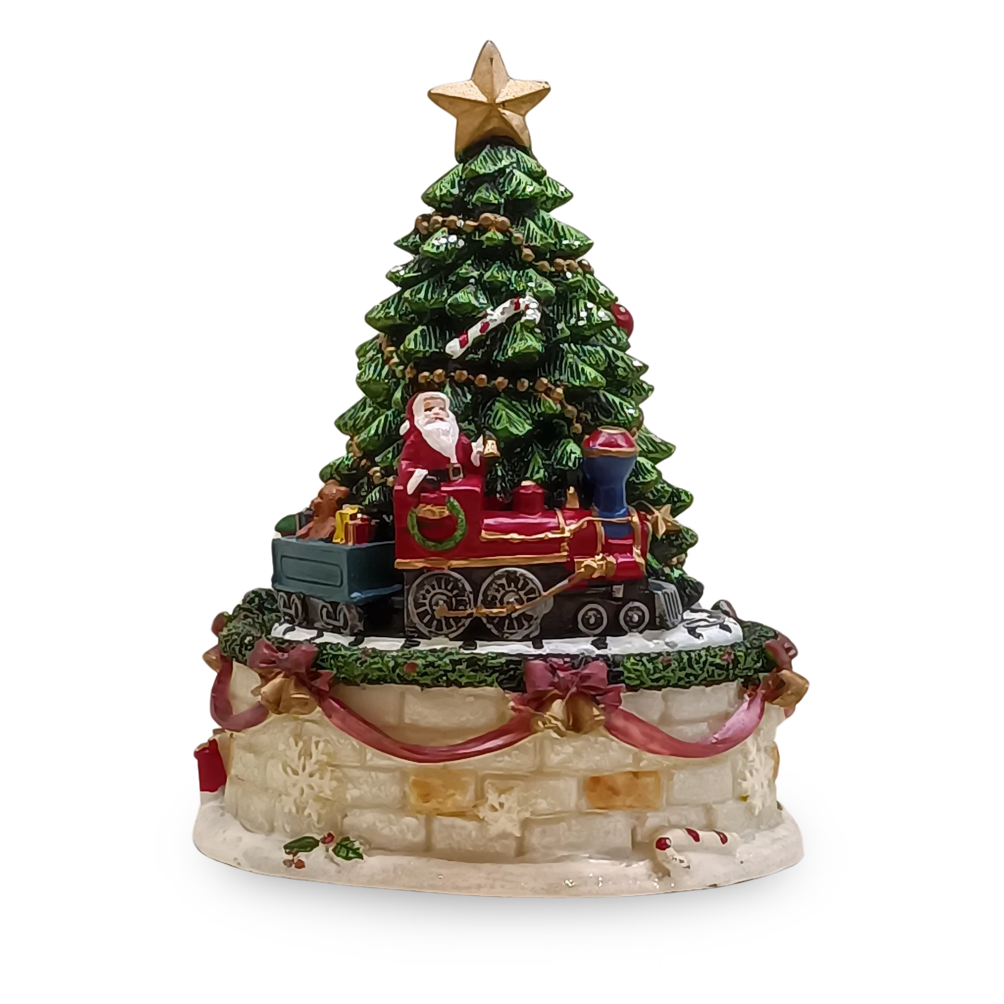Árvore de Natal e Comboio com Pai Natal giram ao som da melodia “Oh Christmas Tree”. Altura 16 cm.